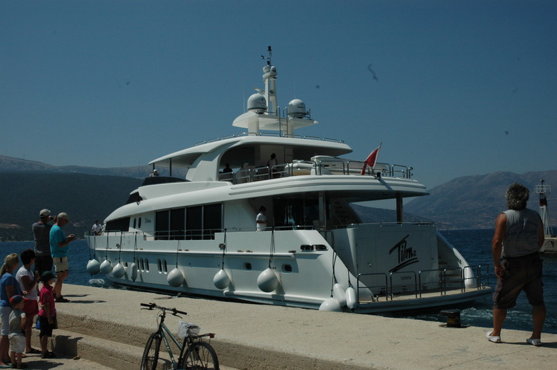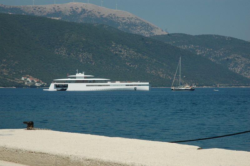 The next morning a huge super motoryacht, approx. 200 ft. anchored in Sami bay…… far too big for the small harbour. The celebrities have certainly arrived this year.