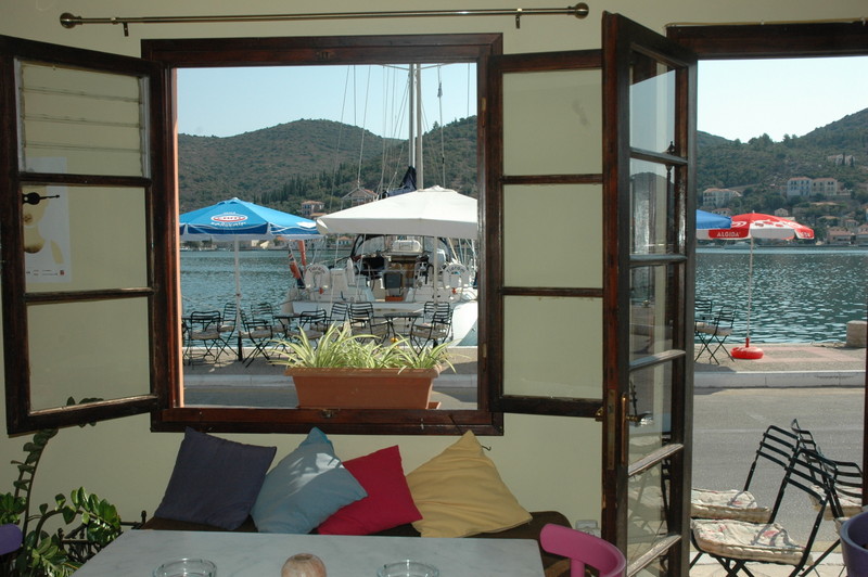 Later we headed for Vathy. The afternoon wind increased and we moored on the north shore quay with a nasty cross wind which blew into the evening. The next day we moved across to the town quay near a café owned by a guy called Spiros…….. see photos of Tioram taken from inside the café looking through the window.