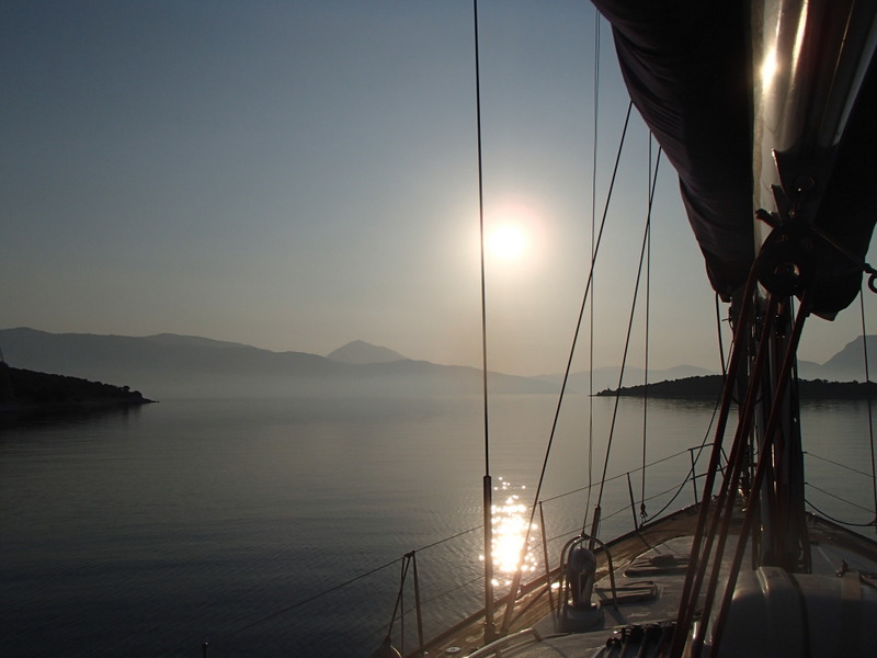 At 12 noon on 25th sept we left Vathy waterfront, lifted the mainsail and motor sailed out of the bay.