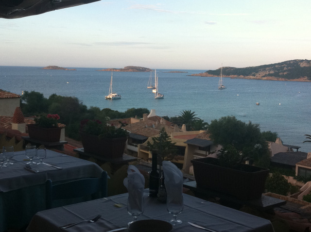 View from the restaurant of Pevero and Tioram at anchor.