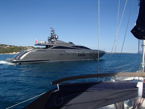 We dropped the anchor in a beautiful bay, called Cala di Volpe, Fox Bay. Soon a big ugly motor yacht was coming very close to anchor on a buoy.