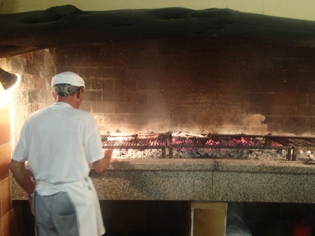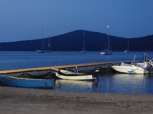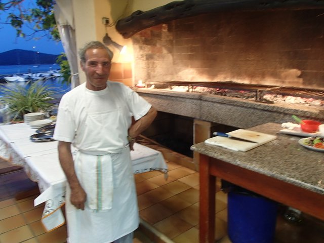 The restaurant has all the characteristics of a Greek beach taverna, rare in Sardinia. We arrived at around 7.30pm, almost the first there thinking that this could be a disaster. Far from it, within half an hour it was full of local people, visitors and yachties. The large BBQ grill kicked off with logs burning and the chef using the logs and cinders to regulate the heat under wonderful fresh fish, sardinian sausages and meats. The open kitchen alongside burst into action and lots of attentive staff served the waiting visitors.