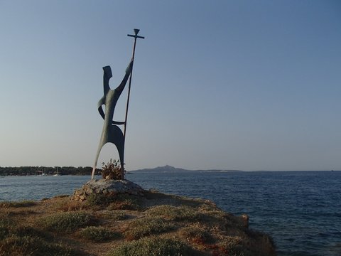 Walking on the tiny Ziu Paulu Island with figurative sculpture.