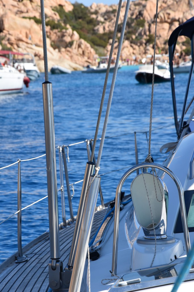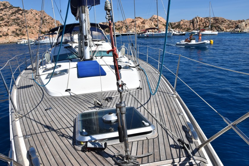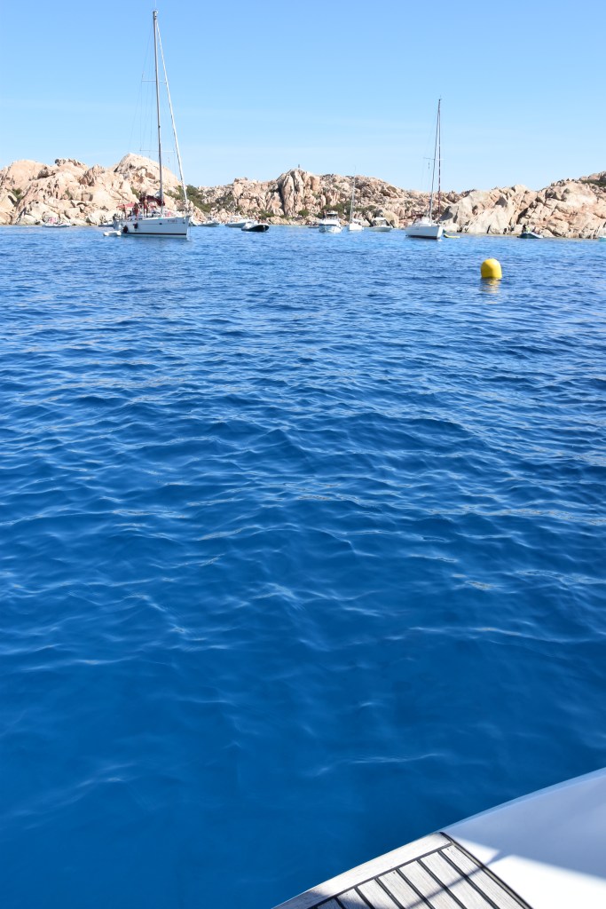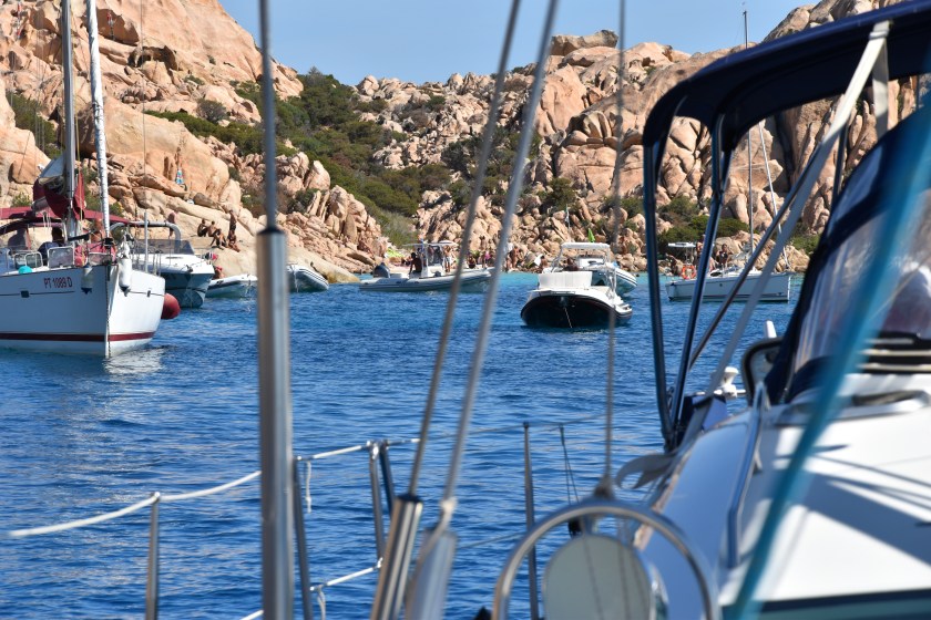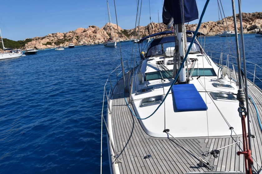Well in high season this stunning turquoise bay is impossible to enter……just tourist boat ‘soup’. So this is the first time w have managed to get any where near the two tiny coves which are like turquoise pools. The only way to these two tiny coves is quite a long walk through the wild countryside of Caprera island and then to follow rocky narrow pathways leading finally to the beach. This makes this location a major tourist attraction for tourists visiting easily by boat. We couldn’t get near the shore even in Sept and so we dropped anchor a short distance out but still in 20 -22 metres. Sardinia and the Maddalena islands have the most spectacular beaches to anchor, but where there is rock it is steep sided like here in Cala Cotticio. Our plan was to be sure we were set and take the dinghy for a short swim in the coves. With so much depth we needed a fair bit of chain down there which gives a big turning circle if the wind should change. We waited and monitored our position before thinking of leaving. After a while we could see that we were very very slowing dragging. So lifted and re set and monitored again. Same very slow problem. So without enough swinging room to drop more chain we decided we couldnt go ashore. We enjoyed the wonderful location for a while before lifting to head to Ziu Paulu to anchor for the night.